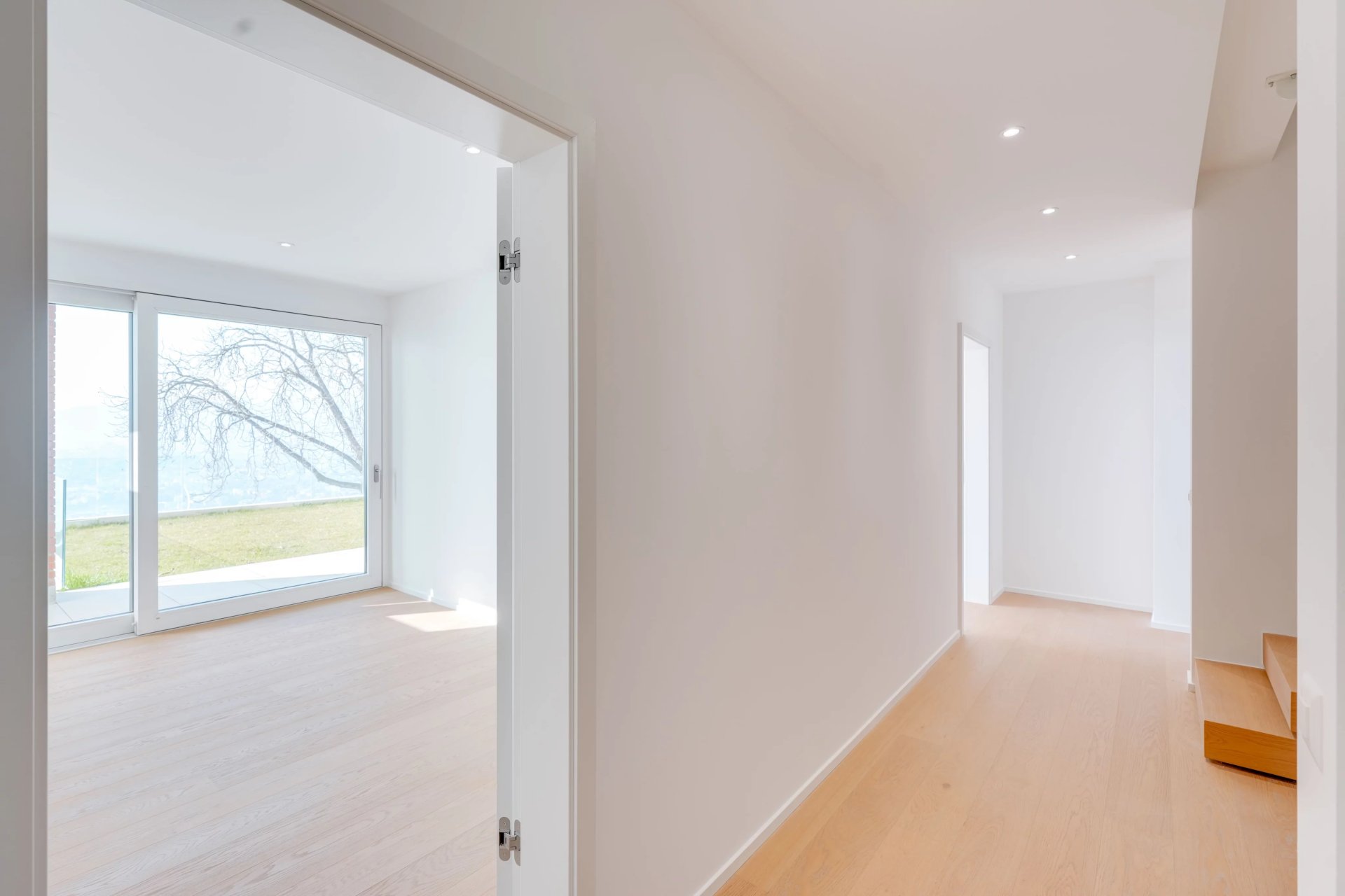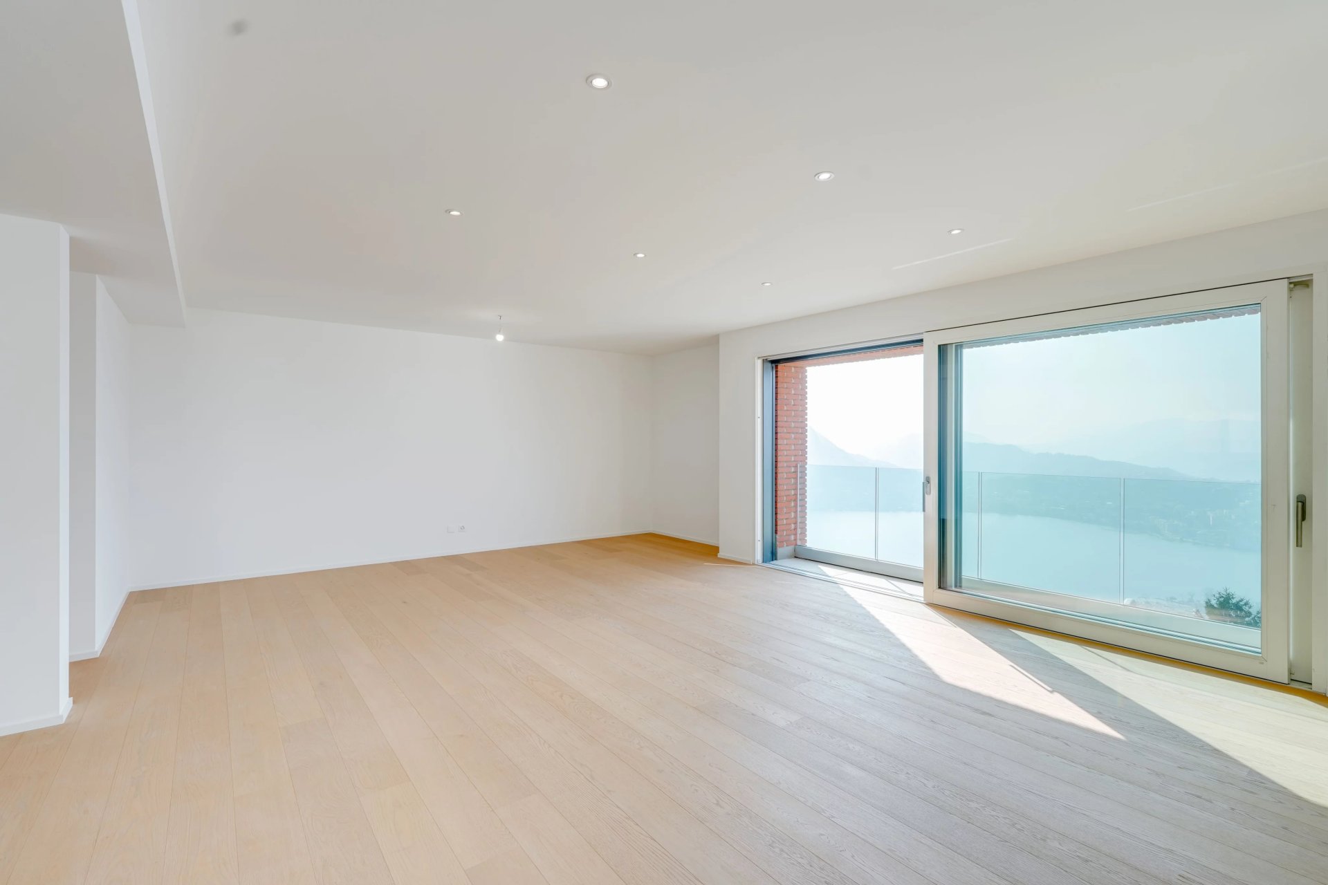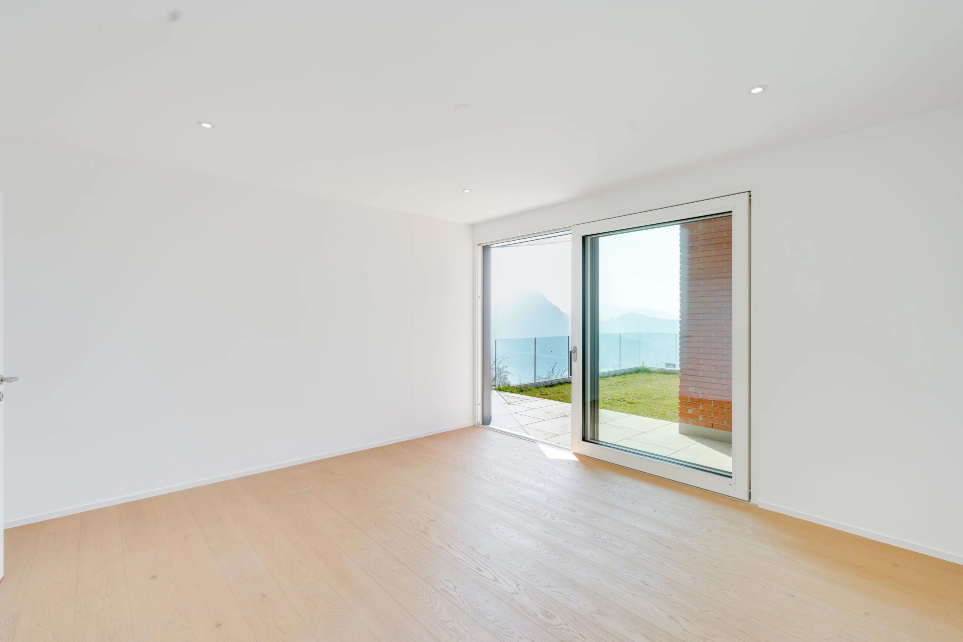 The villa offers 270 m² of living space, 98 m² of terrace space, 4 bedrooms, and 2 bathrooms. The light-filled living area opens onto a well-kept garden and a spacious roof terrace – both with spectacular 180° views over the Gulf of Lugano and Monte San Salvatore. High-quality materials, modern building services, and a well-thought-out room concept ensure an exclusive living experience. Two garage spaces complete the offer.