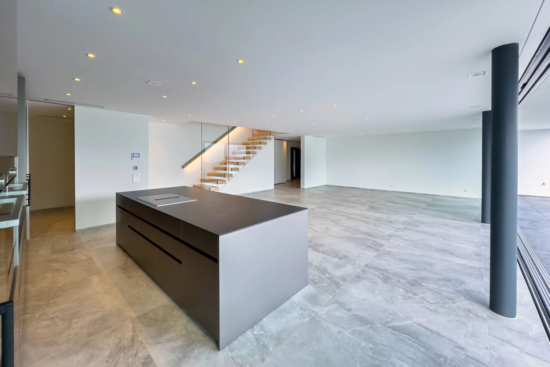 Large windows offer spectacular panoramic views of Minusio. The combination of natural light, modern materials, and clean lines creates a stylish living environment.