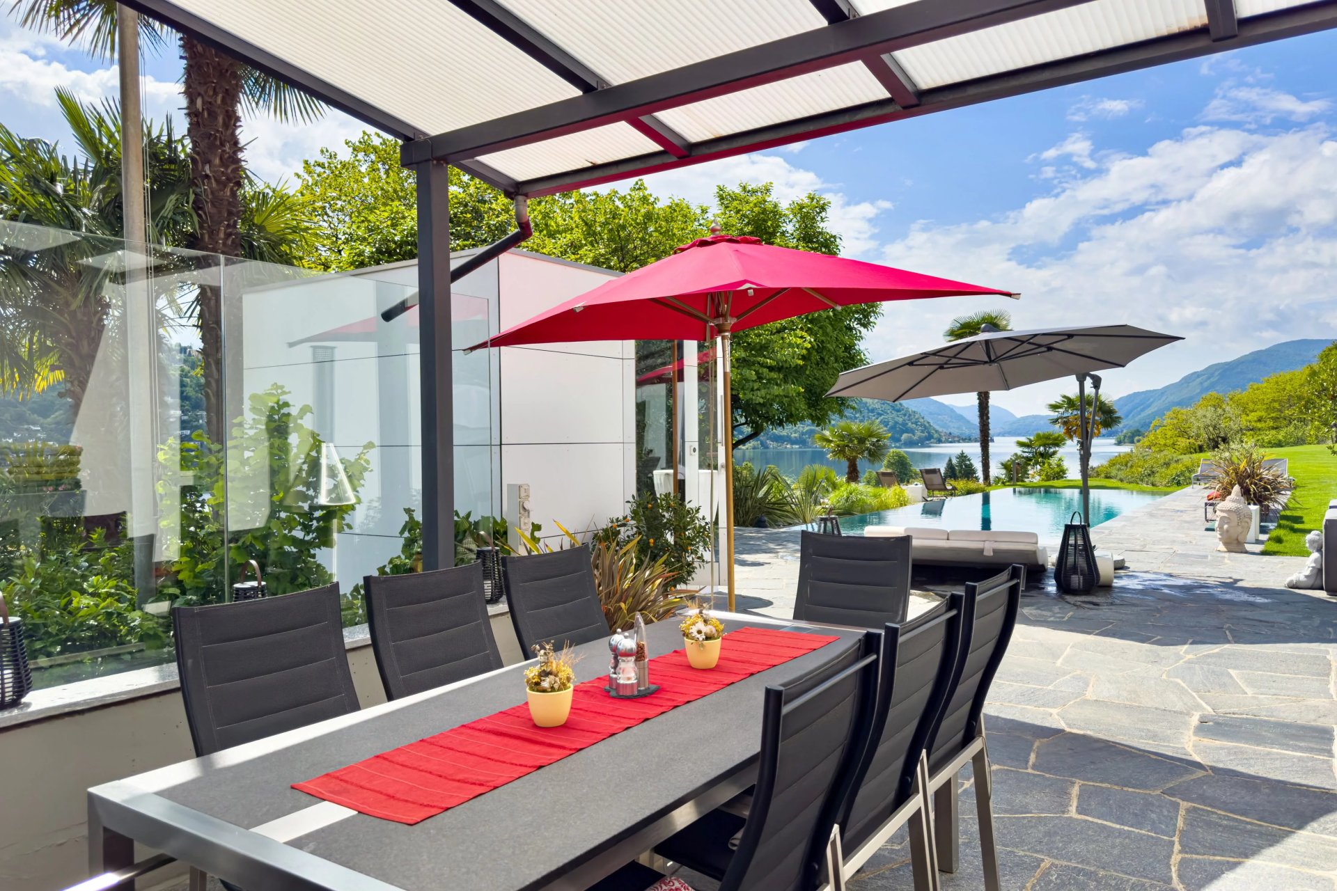 Der Infinity-Pool mit Seeblick, die Gartensauna und die weitläufigen Terrassen bieten pure Entspannung. Hier verschmelzen Exklusivität und Wohlbefinden zu einem privaten Rückzugsort.